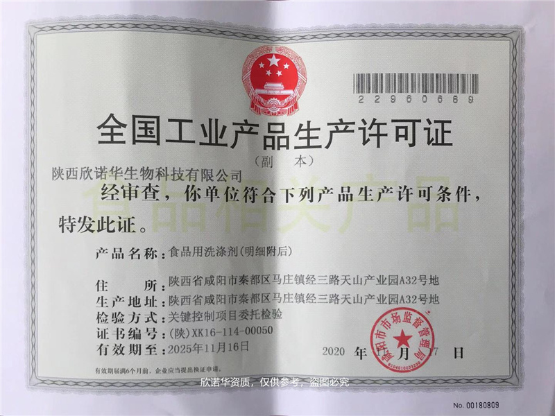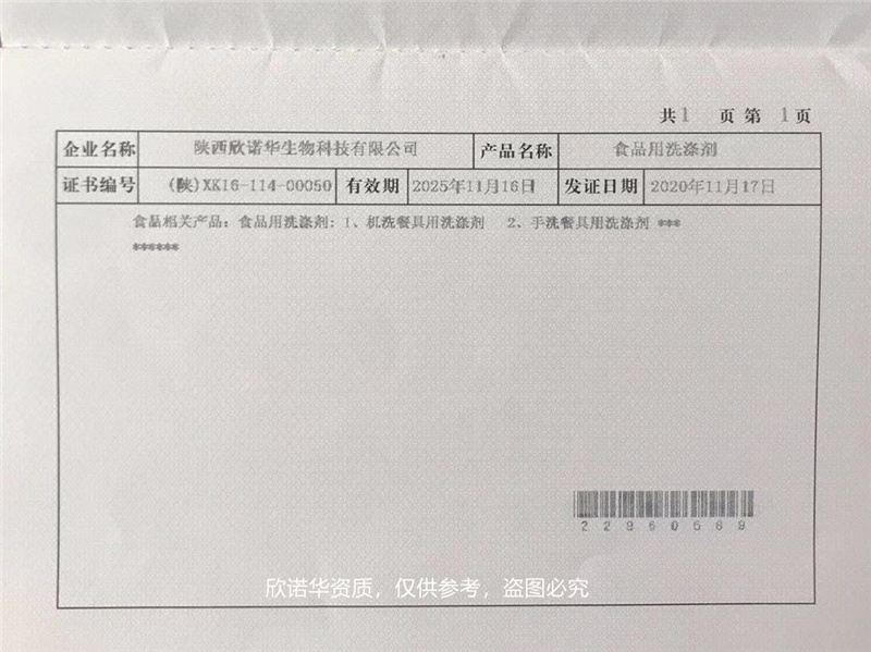 陜西欣諾華生物科技有限公司是陜西省一家同時獲得食品用洗滌劑B類和A類產(chǎn)品生產(chǎn)許可的企業(yè)!可同時生產(chǎn)手洗餐具洗滌劑,機(jī)洗餐具洗滌劑的企業(yè),公司將繼續(xù)以好的產(chǎn)品,優(yōu)的服務(wù)回饋廣大客戶,本公司前身(陜西三橋精細(xì)化工有限公司)生產(chǎn)的三橋牌食品工業(yè)酸堿清洗劑已連續(xù)十一年在省市及國家質(zhì)監(jiān)部門組織的飛行檢查中,為合格產(chǎn)品,請廣大客戶放心使用。