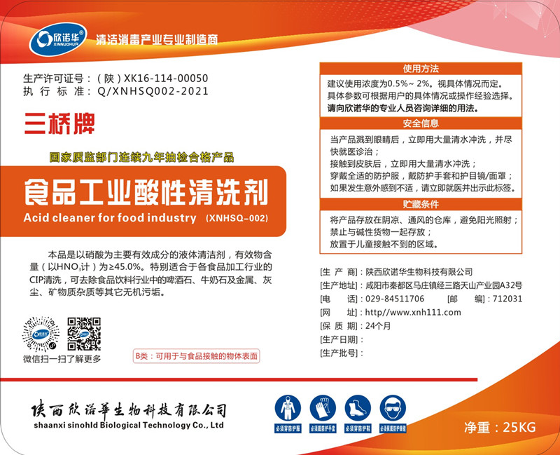 陜西欣諾華生物科技有限公司是生產(chǎn)食品級硝酸(三橋牌食品工業(yè)酸性清洗劑)的專業(yè)廠家,生產(chǎn)許可證號:陜XK16-114-00050有效成份為35~60%,特別適合用于食品、飲料、乳品、啤酒等行業(yè)設(shè)備,容器、管道的CIP清洗使用。