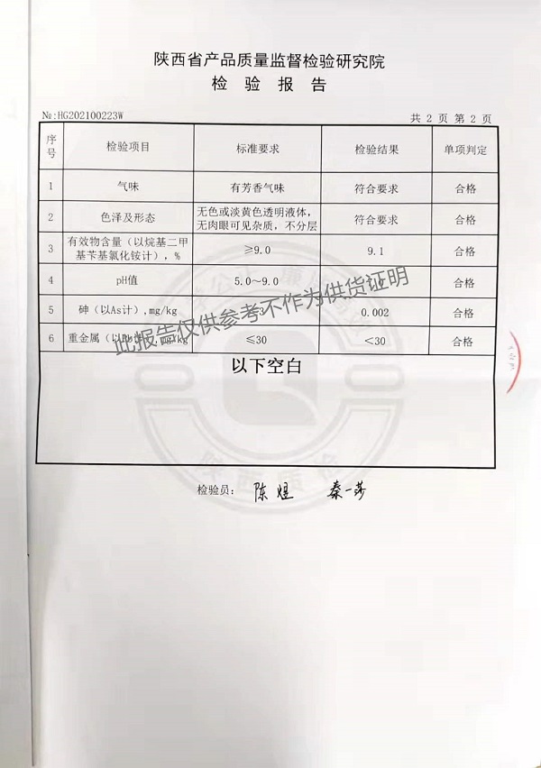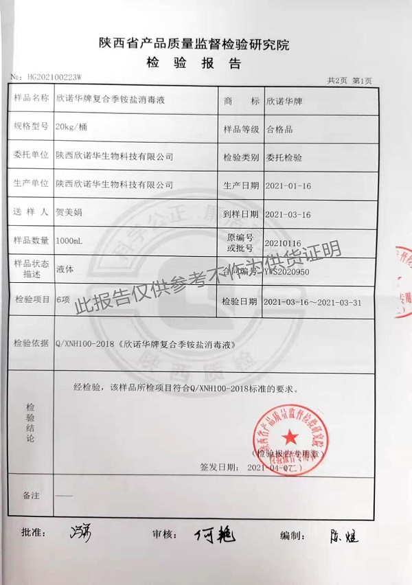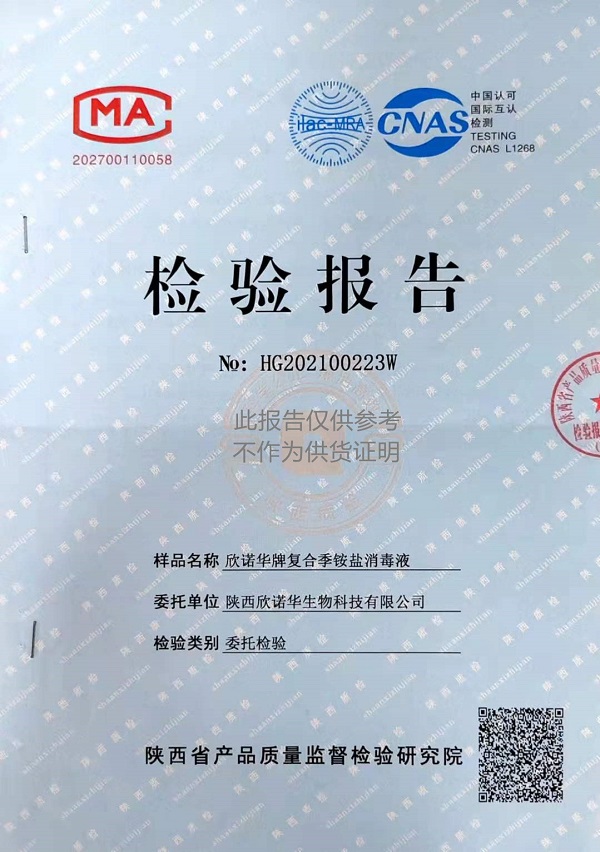 欣諾華牌復(fù)合季銨鹽消毒液(XNH100型)檢測(cè)報(bào)告(2021年度)-陜西欣諾華生物科技有限公司