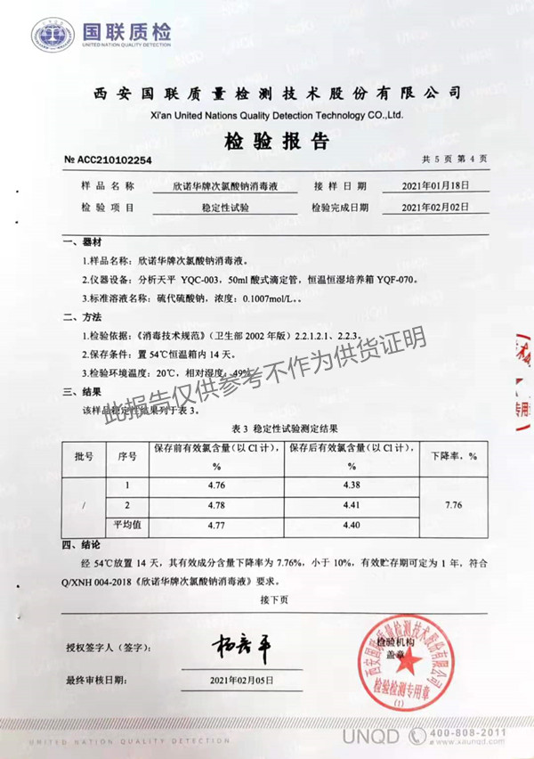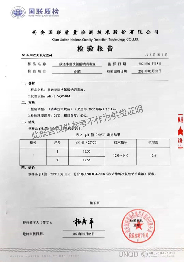 欣諾華牌次氯酸鈉消毒液(XNH004型)檢測報告(2021年度)-陜西欣諾華生物科技有限公司