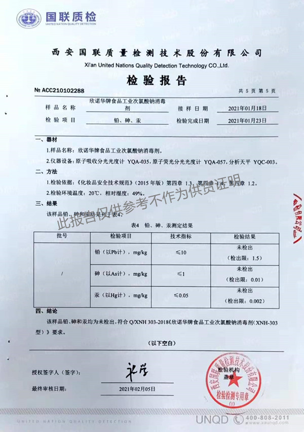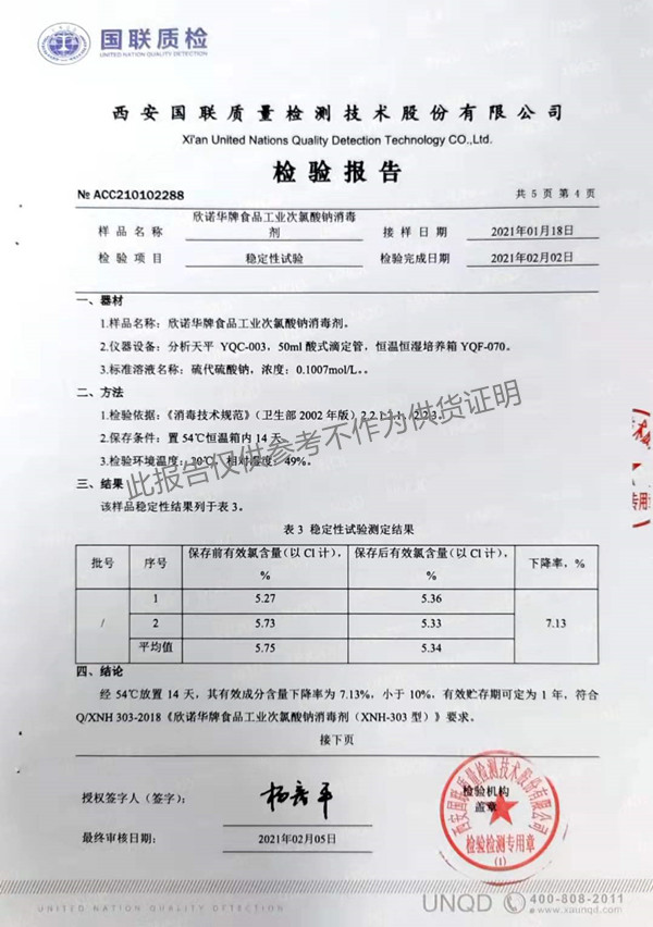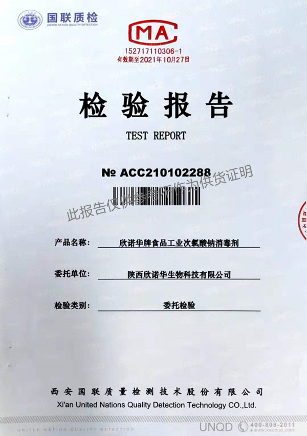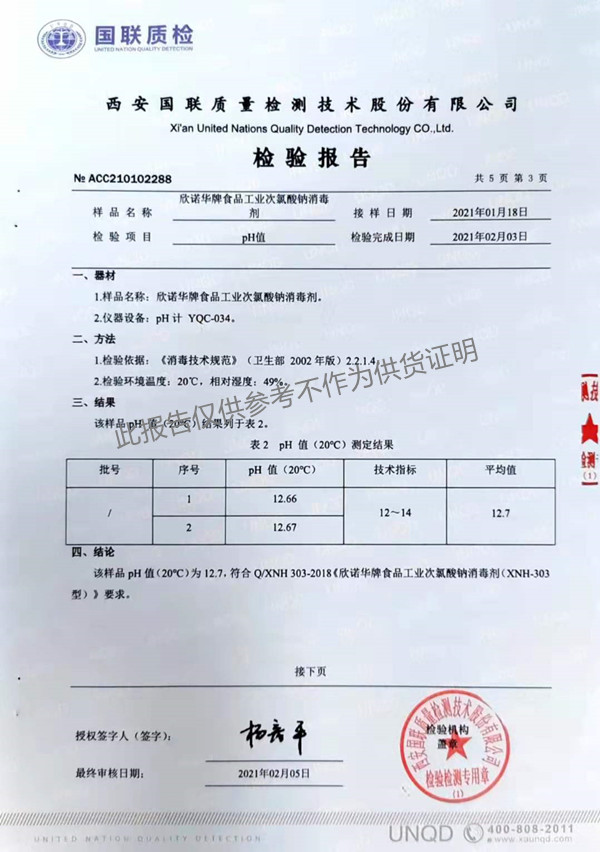 欣諾華牌食品工業(yè)次氯酸鈉消毒劑(XNH303型)檢測報告