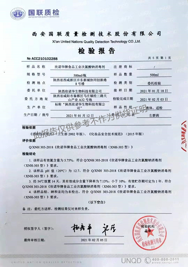 欣諾華牌食品級次氯酸鈉消毒劑檢測報告(XNH303型)(2021年度)-陜西欣諾華生物科技有限公司