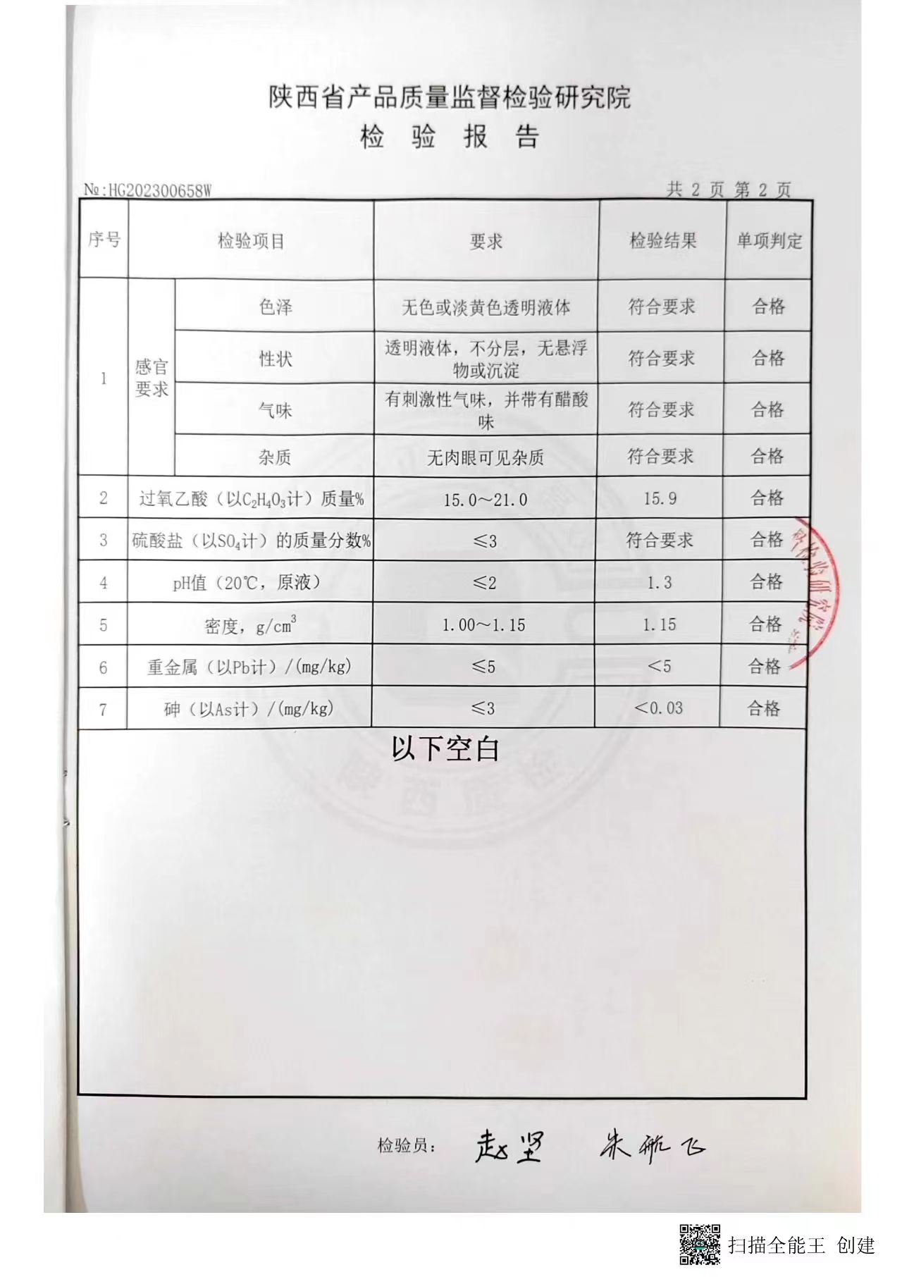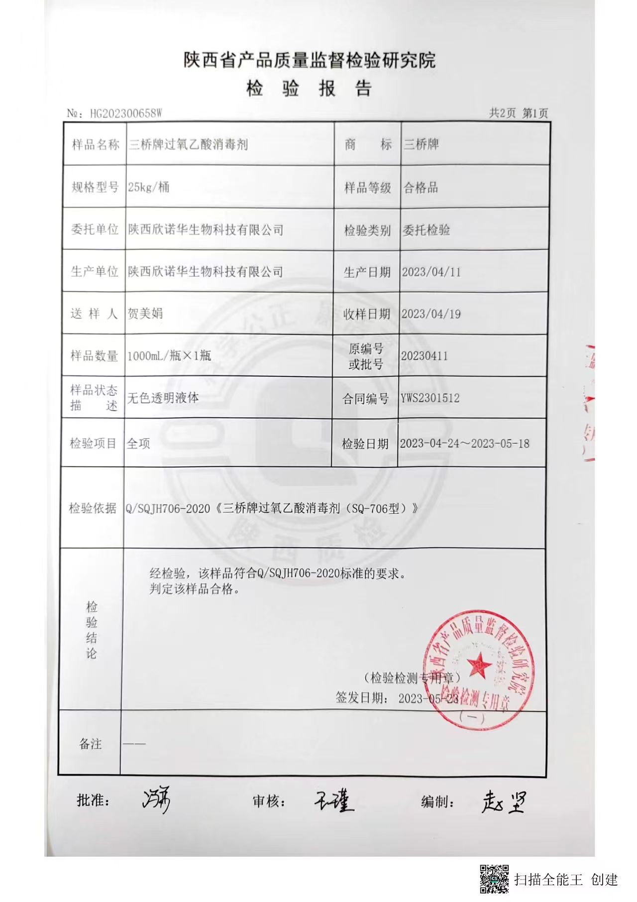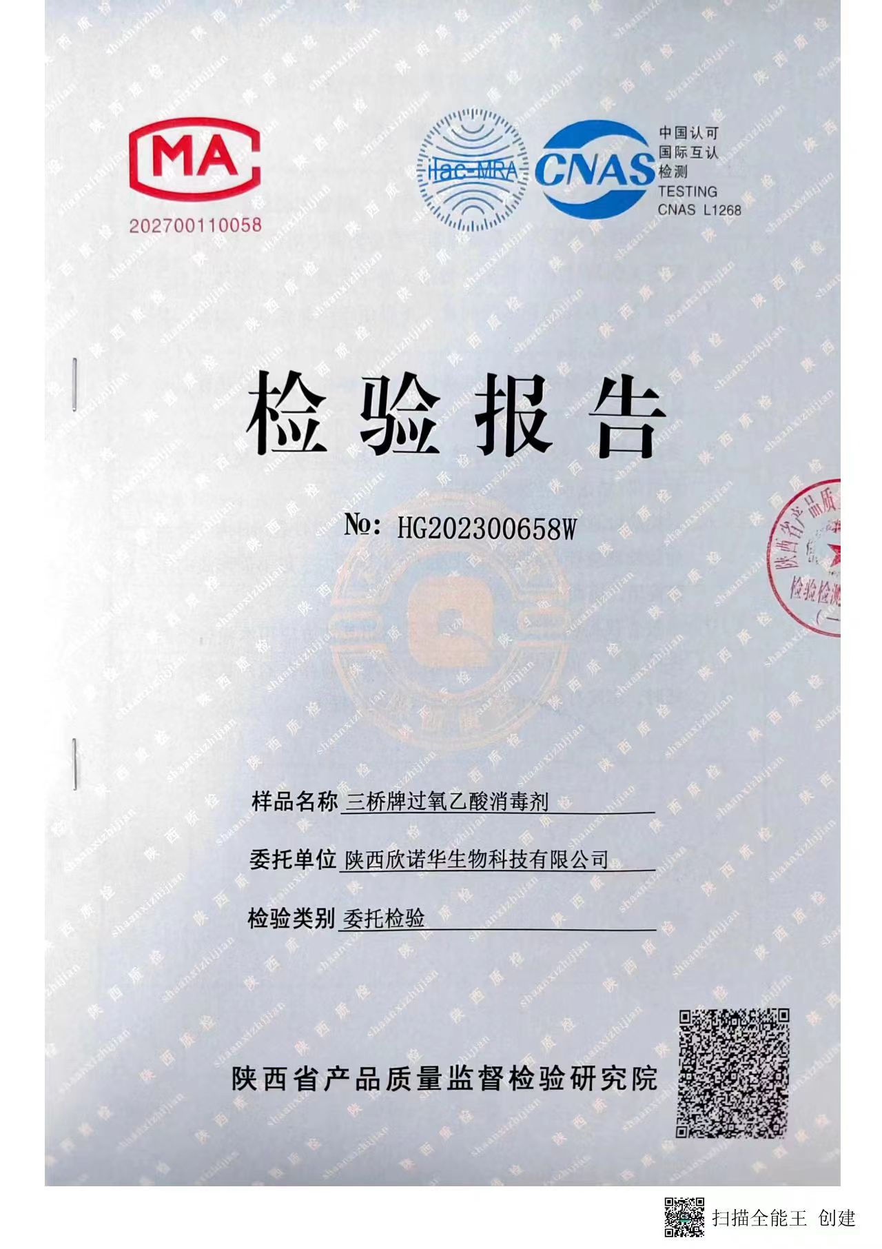 三橋牌過氧乙酸消毒液第三方檢測報告(2023年度)-陜西欣諾華生物科技有限公司