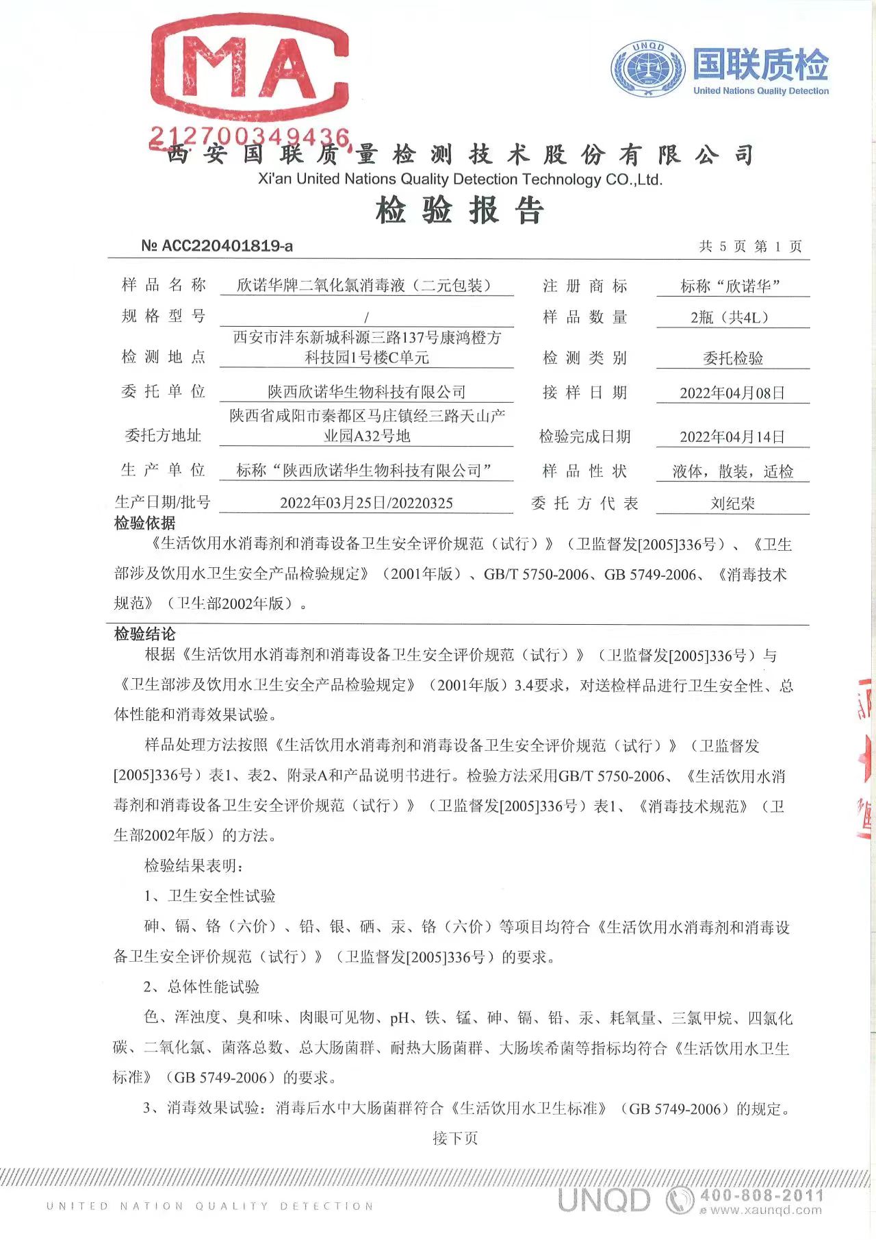 二氧化氯消毒液(商品名稱:欣諾華牌二氧化氯消毒液)第三方檢測(cè)報(bào)告,本品是以二氧化氯為主要有效成分的消毒液,主要用于生活飲用水消毒,二次供水消毒。含量:2.0%,生產(chǎn)商;陜西欣諾華生物科技有限公司,服務(wù)熱線:13991111706(微信同號(hào))