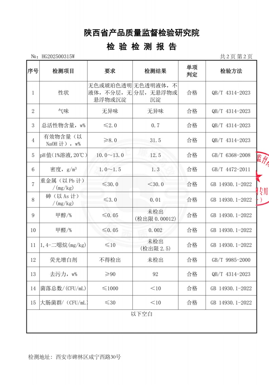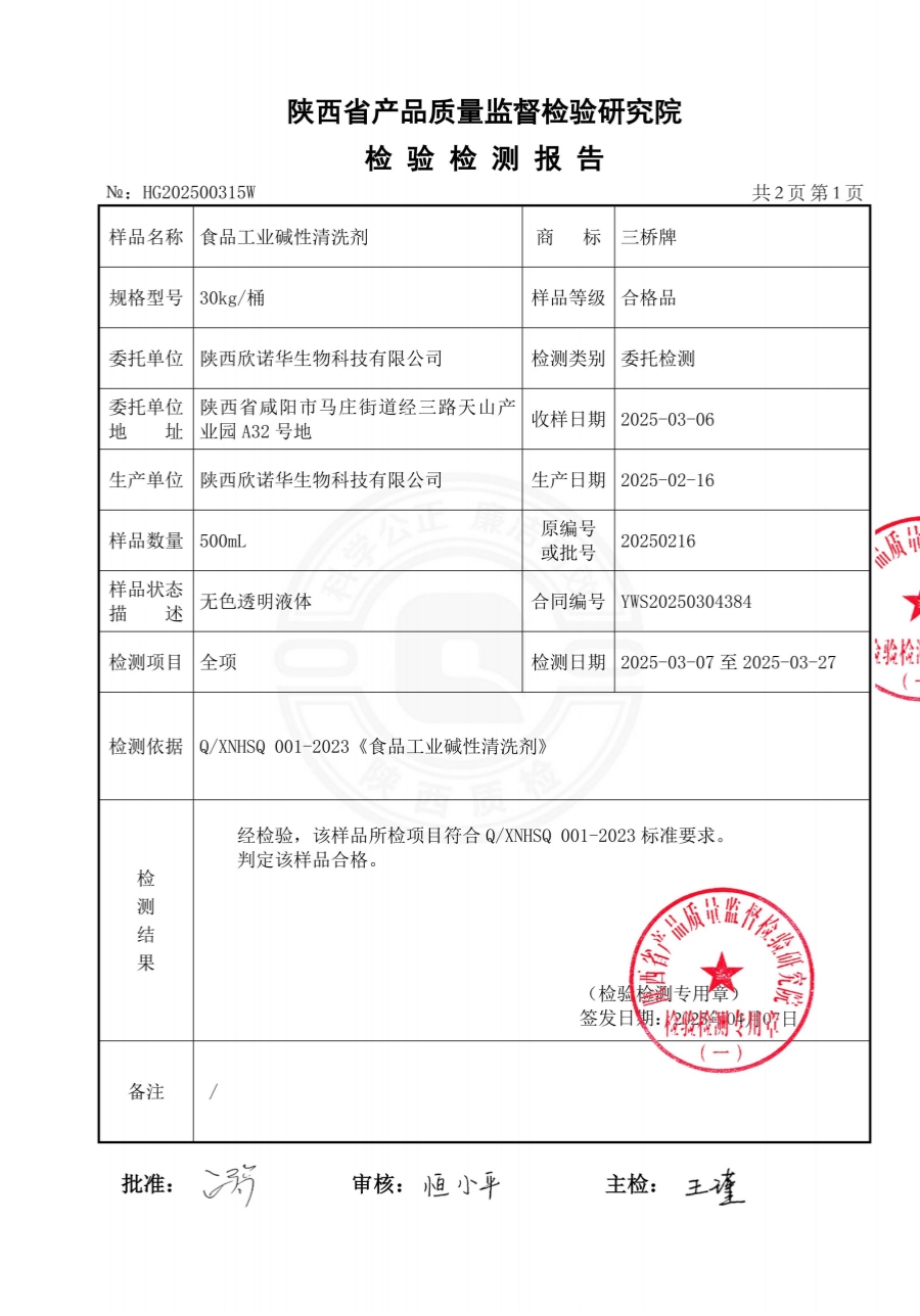三橋牌食品工業(yè)堿性清洗劑檢測(cè)報(bào)告(2025年度)-陜西欣諾華生物科技有限公司
