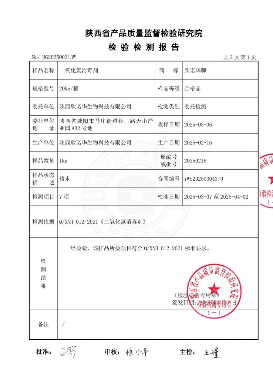 二氧化氯消毒液第三方檢測(cè)報(bào)告(2025年度)-陜西欣諾華生物科技有限公司
